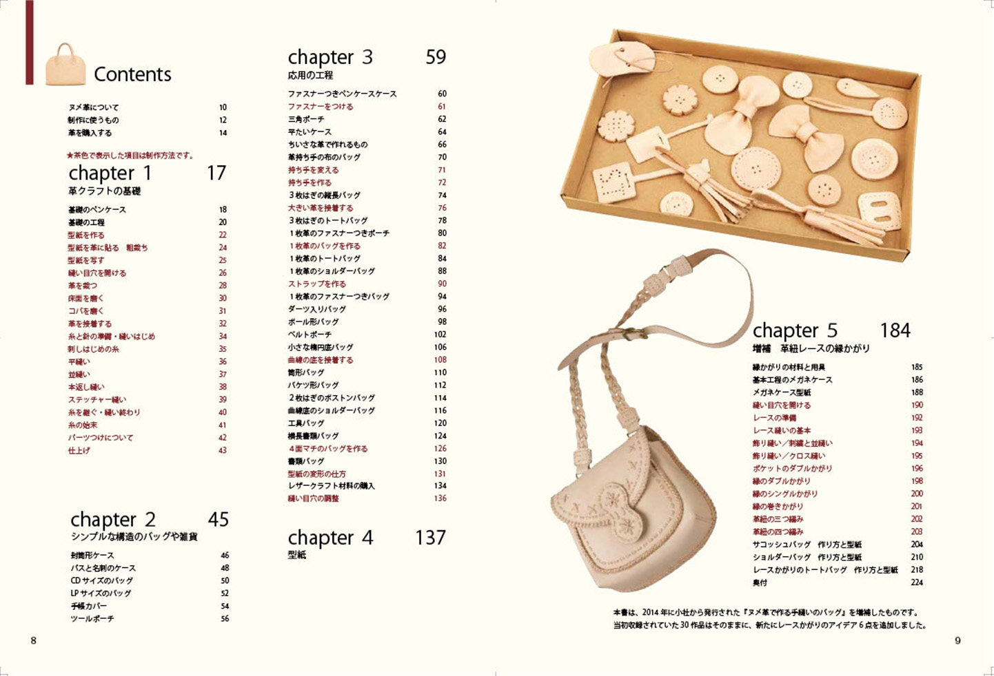革の風合いと手縫いの良さを最も表現できる「ヌメ革」にこだわったレザークラフト本。基本のバッグと同じ型紙でバッグバリエーションはもちろん雑貨制作もできる「自分で型紙を作る」ことを可能にした技法書。革ひもレースかがりと装飾テクニックを使った5作品を増補。