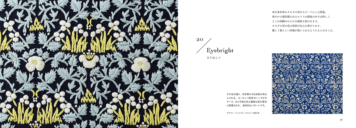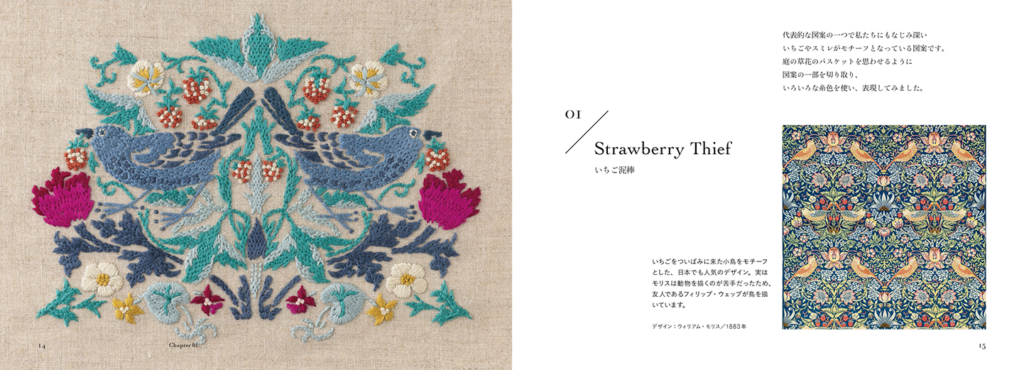 長年、世界中の人々に親しまれてきたウィリアム・モリス作品「いちご泥棒」や「兄弟うさぎ」など、全20種類の模様を図案化。モリス没後130年を迎える節目の年に、国内初の刺繍図案集を提案します。