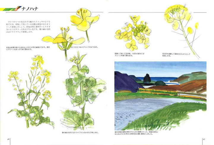 花の種類別に、形の特徴と描き方・色がわかる。さらに花を組み合わせたり、花風景など、花を絵にする作風選びにも役立ちます。