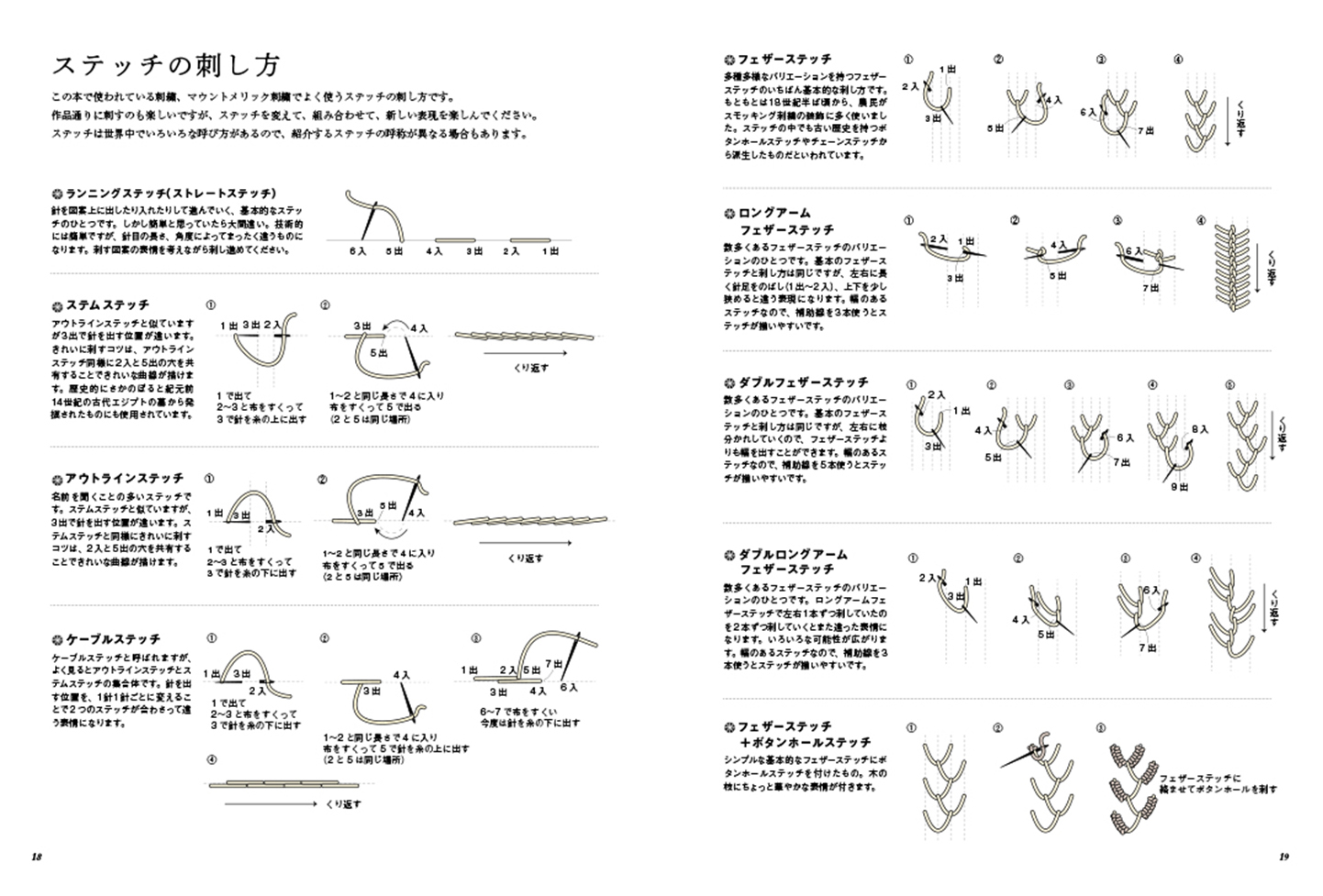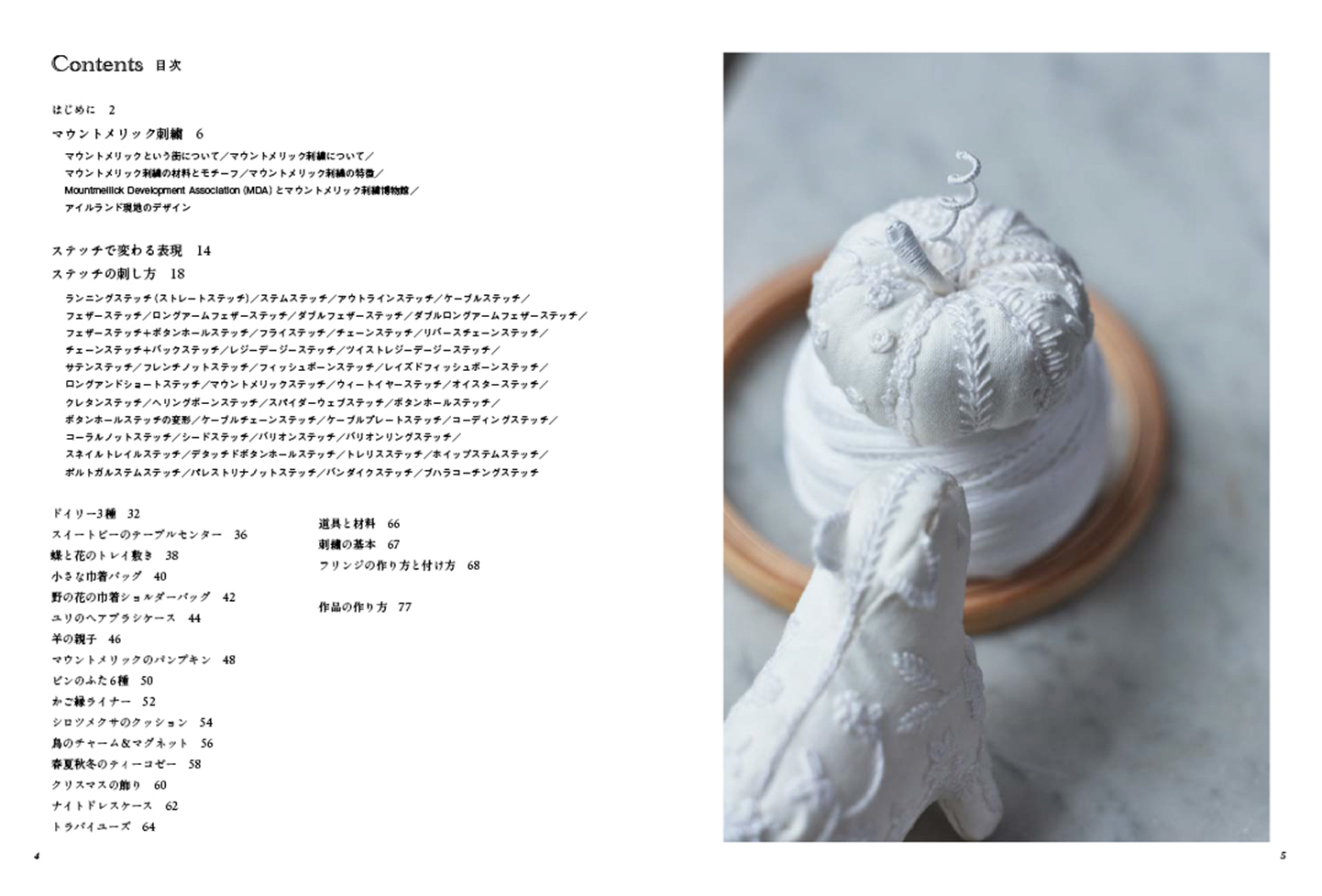 マウントメリックというアイルランドの伝統的な白糸刺繍のはじめての本。厚手のコットンの布にコットンの糸で刺し、他の白糸刺繍のように穴を開けたり糸を抜いたりという繊細で高度な技術は使わない、日常使いをするための刺繍です。さまざまなステッチを使って自然を描くため、本にもたくさんの種類のステッチを掲載しているのでしっかり勉強になります。周囲にフリンジがつくタイプがあるのも特徴です。飾るためではない、日々の暮らしとともにあるマウントメリック刺繍は素朴さのある美しさと実用性の高さが魅力です。